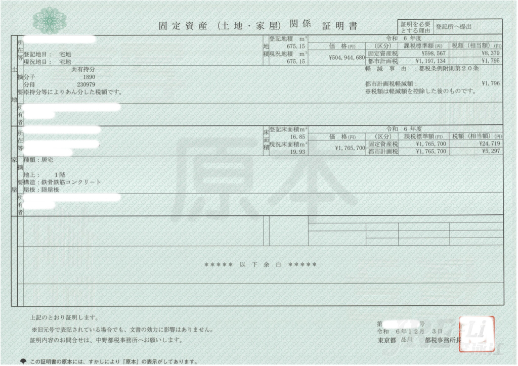 当年度的关系证明书6月1日发行,因此6月1日以前取得的“关系证明书”表示的是上一年的税额,如果使用4月1日之后取得的评价证明书进行计算,可能税额不同。