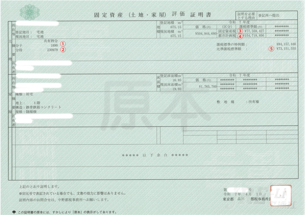 关系证明书中的【课税标准额】可以通过次年度的【比准课税标准额】乘以持有比例得到,再乘以税率便得到了右边的【税额(相当额)】(省略到整数位)。