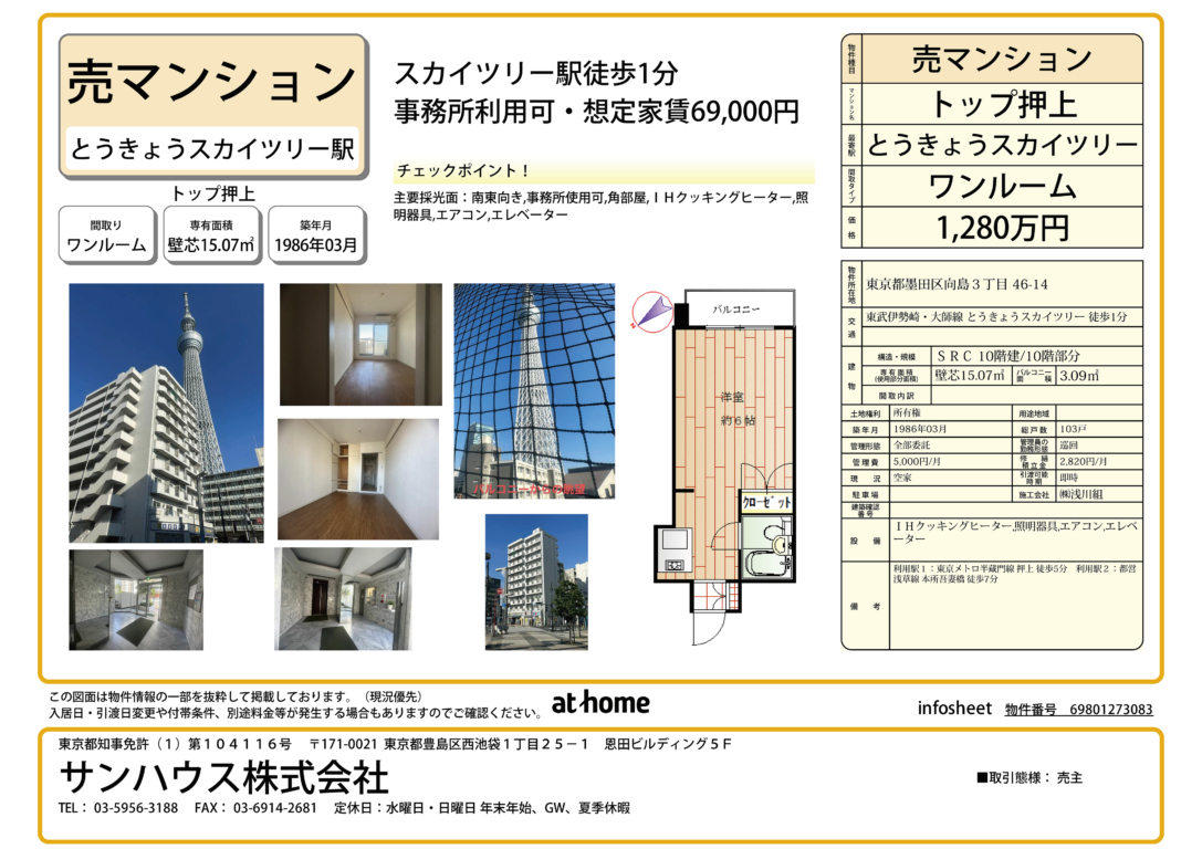 东京热门景点天空树徒步1分,可用作事务所使用。1986年新耐震基准,10楼东南向采光视野好。目前空室,非常适合登记公司办理签证。自住投资皆可。