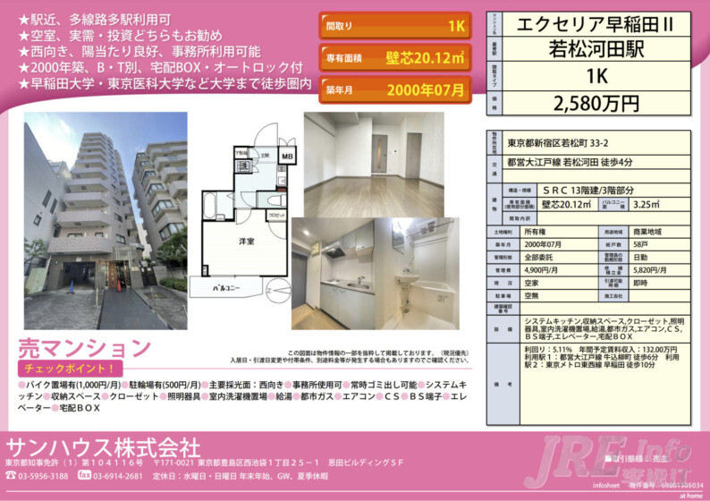 位于新宿区,世界名校早稻田大学,东京医科大学徒步范围。2000年建,可用作事务所。空室自己使用或投资皆可。干湿分离。
