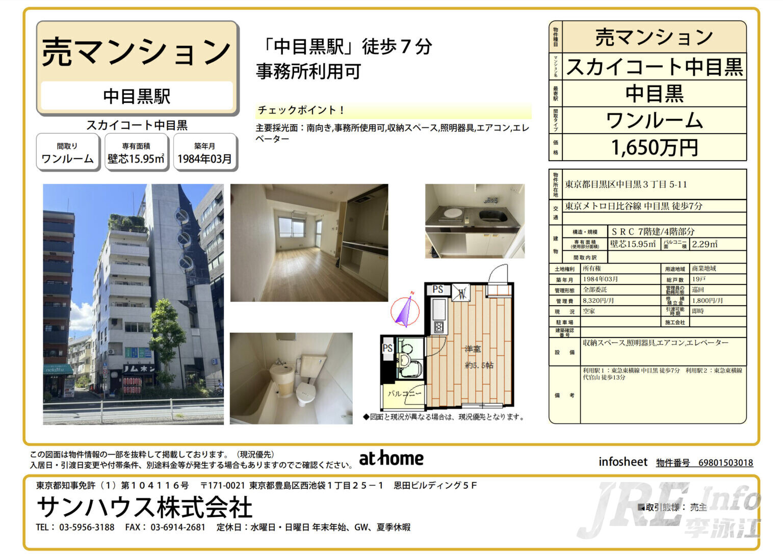 位于目黑区,临近樱花圣地目黑川。交通便利,商业地域土地价值高,增值空间大。可以用作事务所,适合登记注册公司,办理投资经营签证。
