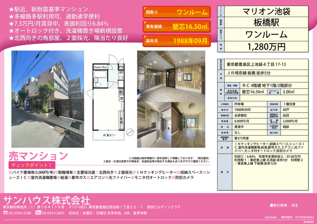 丰岛区新耐震投资物件,多线路可用,带有门禁系统。带租约出售,高回报率6.8%,买下即开始收租。