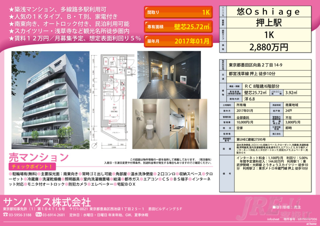 2017年建成的这栋位于押上的房产距离天空树仅徒步8分钟,而且是少有的可以用作民宿(也称为“民泊”)的物业,极具投资价值。带租出售更安心,多户型先到先得。