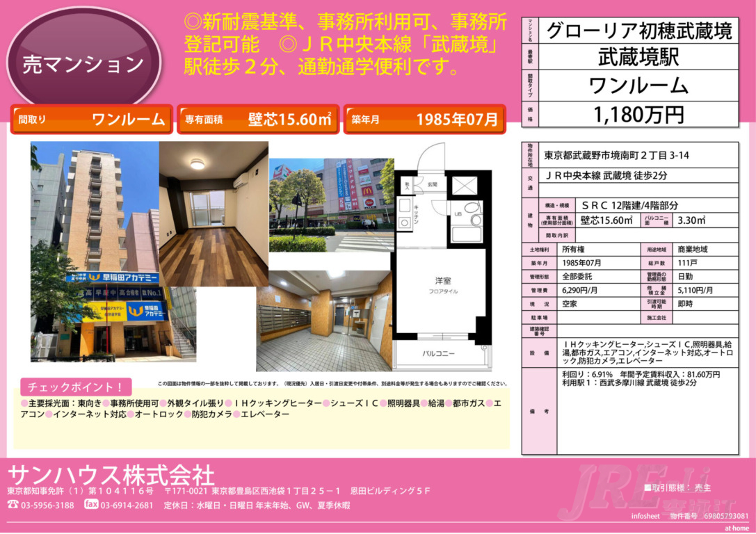 武藏野市优质投资物件,距离武藏境站仅需步行2分钟,方便日常通勤和上学。可以作为事务所使用,将来可以注册公司或者出租商用,极具投资价值。而且是自社卖主物件,直接联系我购买无中介费!
