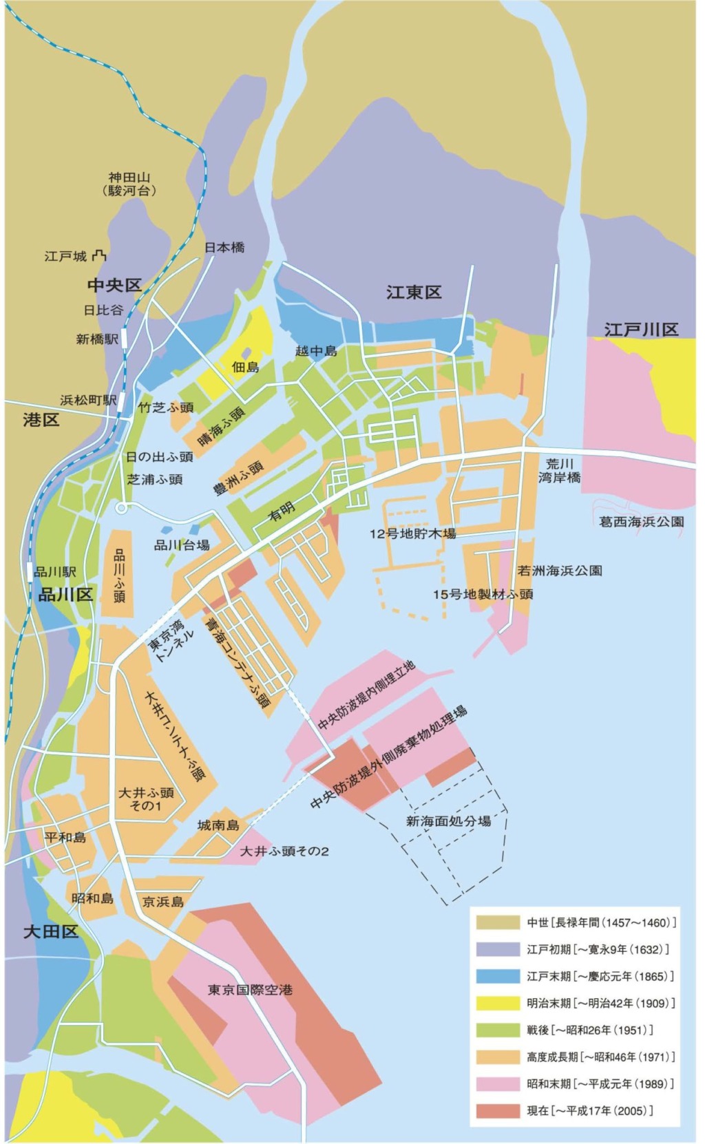 在战后的高度经济成长期,东京港的修筑工程带来了豊洲码头和品川码头的形成,晴海码头也得到了扩建。此外,为了解决住房、环境和垃圾处理的问题,江东区辰巳、东云、有明、台场的填海造地也在这个时期进行。